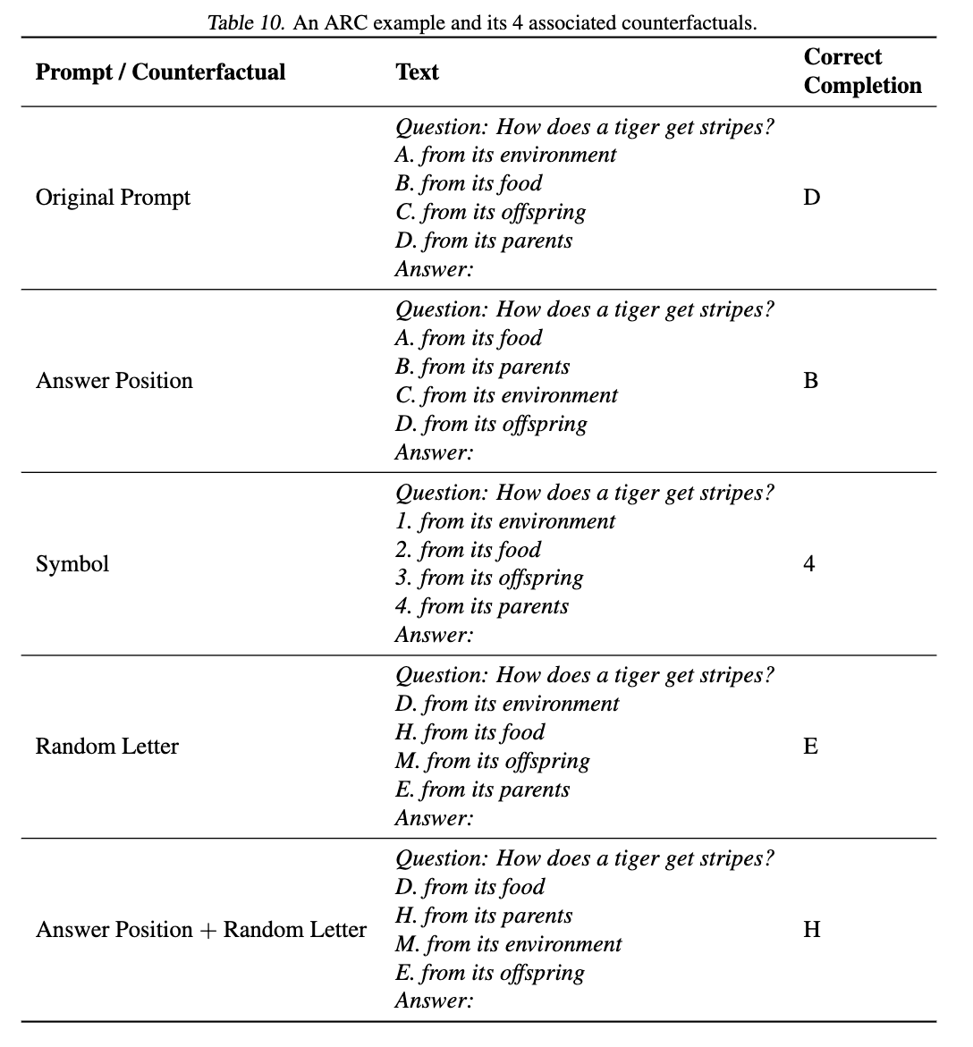 The dataset consists of three subsets, corresponding to three types of counterfactuals: answerPosition (only change the orders of choices), randomLetter (only change the choice letters) and answerPosition_randomLetter (change both choice orders and letters). Examples of these counterfactuals are shown in Figure 2.