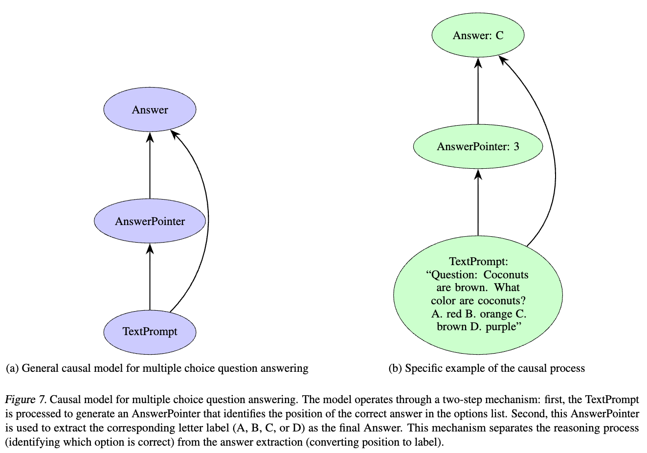 We use the case of multiple-choice task to help readers understand. The high-level causal model of multiple-choice tasks, $\mathcal{H}$ (shown in Figure 1) defines two important causal variables: $X_\text{Order}$ (position of the answer) and $O_\text{Answer}$ (answer token). According to Mueller et al.