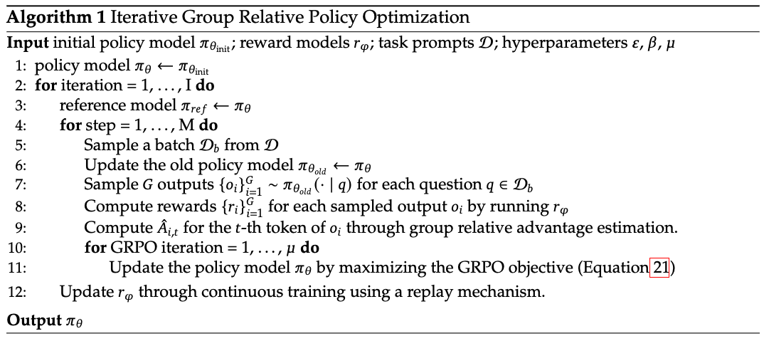 \[\mathbb{D}_{\text{KL}} \left(\pi_\theta \Vert \pi_\text{ref} \right) = \frac{\pi_{\theta_{\text{ref}}}(o_{i,t} \vert q, o_{i,\lt t})}{\pi_{\theta}(o_{i,t} \vert q, o_{i,\lt t})} - \log \frac{\pi_{\theta_{\text{ref}}}(o_{i,t} \vert q, o_{i,\lt t})}{\pi_{\theta}(o_{i,t} \vert q, o_{i,\lt t})} - 1.\]The algorithm for iterative GRPO (Figure 1) shows how reference model and old policy model are iteratively updated. The old policy model is frequently updated for each sampled batch while the reference model is updated at larger intervals.